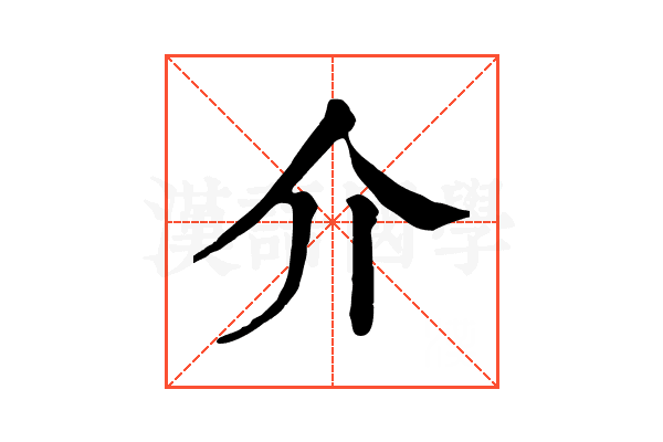 〔介〕字造字法是象形。甲骨文字形,象人身上穿着铠甲形。中间是人,两边的四点象联在一起的铠甲片。本义是铠甲。一种用来防身的武器。
