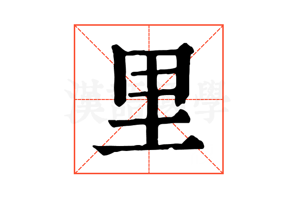 〔里〕字拼音是lǐ,上下结构,可拆字为田、土、!、甲、二、!、、一,五行属火。