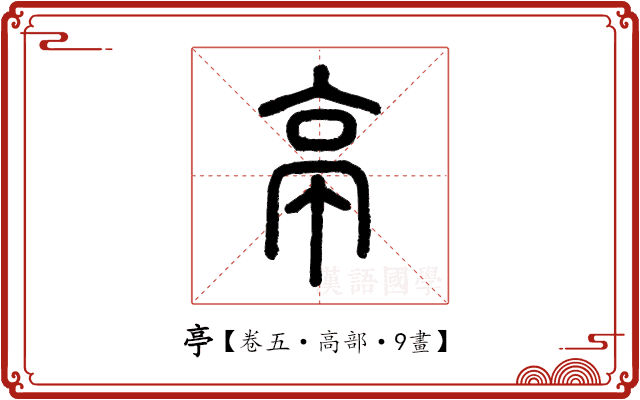 亭,路边可以让百姓行人安定歇息的建筑。亭上有楼,因此字形采用有所省略的“高”作边旁,采用“丁”作声旁。