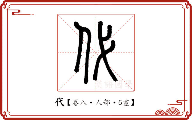 此字始見於戰國文字。戰國文字作,從人,意指人事,「戈」為聲符,注明音讀。代、表示人事的更替。篆文、隸書承之,楷書沿之而定體。在六書中屬於形聲。