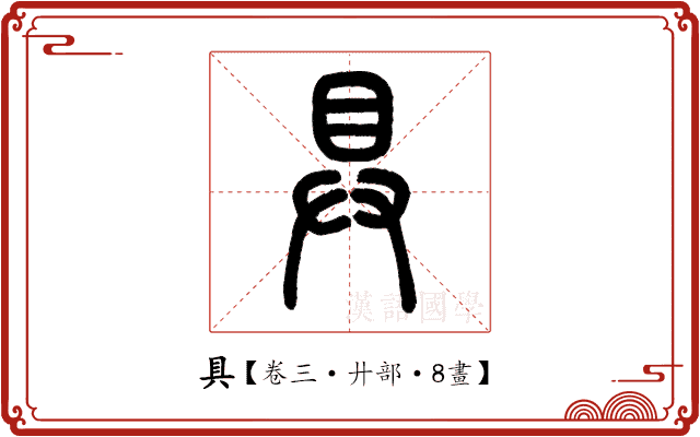 甲骨文「具」字本從鼎、從廾。從鼎表示準備食物時用來盛裝的器皿,鼎是祭祀宴饗時的主要用器;從廾表示態度恭敬的捧著。金文中「鼎」省作「貝」,有的省作「目」。戰國文字與篆文都是從省作目而來的。隸書把「目」形和「廾」形相連在一起,楷書是根據連接後的字形。在六書中屬於異文會意。