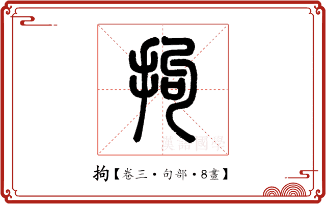 拘,阻止。字形采用“手、句”作边旁,采用“句”也作声旁。