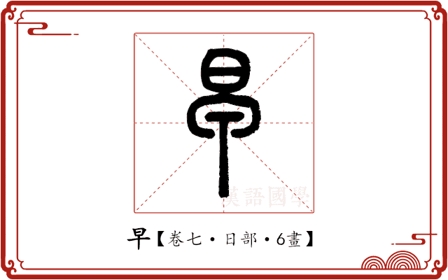 早,戰國中山王器有從日、從棗聲字,應為目前最早見的「早」字。在六書中屬於形聲。戰國文字據金文字形省,另已見有早字形,與隸、楷相同。篆文改從日在甲上。《說文》:「晨也。」段注:「晨者,早昧爽也。引伸為凡爭先之偁。」隸、楷字復誤甲為十。