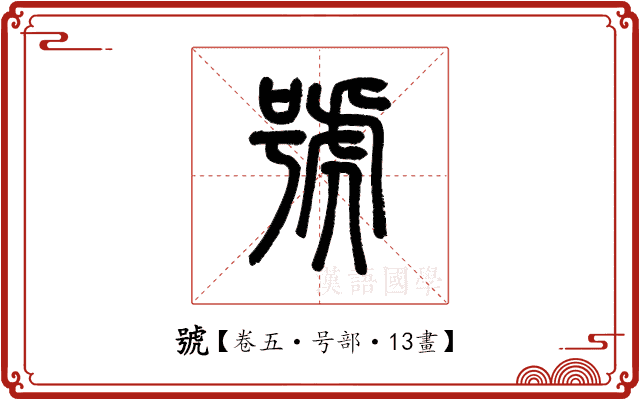 此字始見戰國文字,與篆文構形相同,皆從号、從虎。《說文‧号部》:「呼也。从号、从虎。」從号,表示與大聲呼叫相關;從虎,表示「呼號」之聲,猶如老虎之厲聲咆哮,本義為大聲呼喊。在六書中屬於異文會意。規範字作「号」。