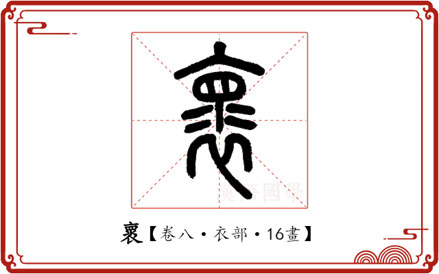 褱,怀挟。字形采用“衣”作边旁,采用“”作声旁。另一种说法认为,“褱”是口袋的意思。