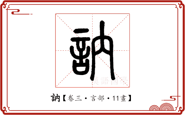 讷,表达困难,言语笨拙。字形采用“言”作边旁,采用“内”作声旁。