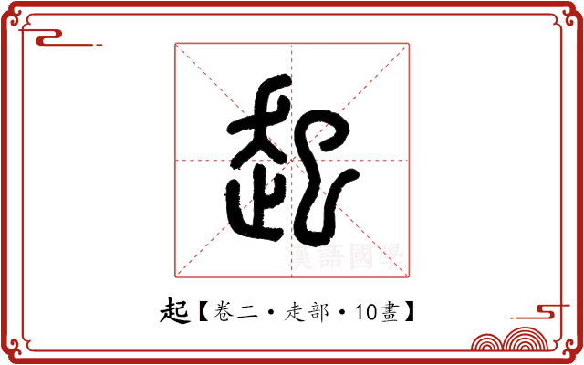 起,能独自站立。字形采用“走”作边旁,采用“已”作声旁。,这是古文写法的“起”字,采用“辵”作边旁。