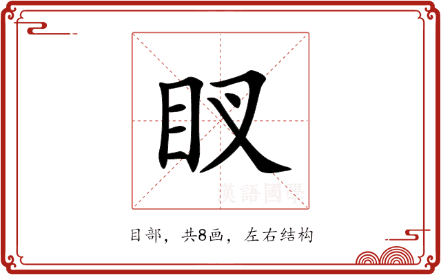 〔䀑〕字是左右结构,可拆字为“目、叉”。