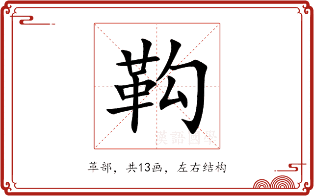 〔䩓〕字是左右结构,可拆字为“革、勾”。