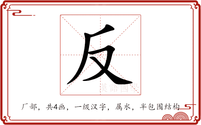 〔反〕字是半包围结构,可拆字为“𠂆、又”或“厂、又”,五行属水。