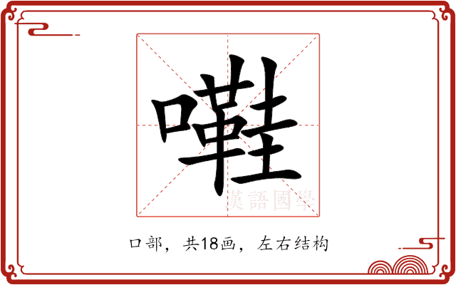 纠错〔嚡〕字是多音字,拼音是(xié、hái),部首是口部,总笔画是18画。