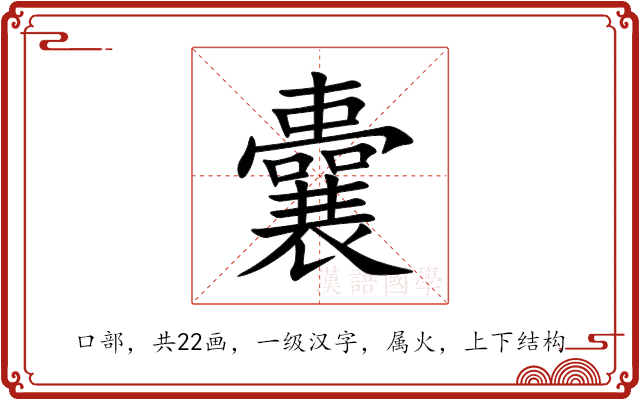 〔囊〕字是上下结构,可拆字为“𰀉、冖、𱔞”,五行属火。