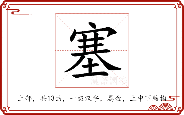 〔塞〕字是上中下结构,可拆字为“𡨄、土”,五行属金。