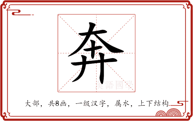 〔奔〕字是上下结构,可拆字为“大、卉”,五行属水。