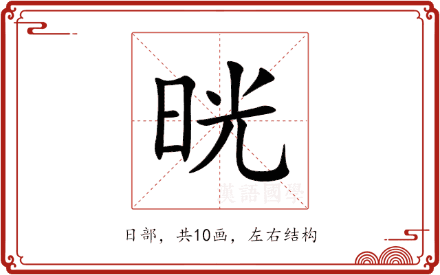晄,位于中日韩统一表意文字 (基本汉字),Unihan编码U+6644,读音是(huǎng),日部,共10画,左右结构。