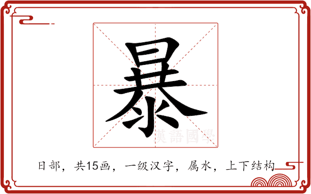 〔暴〕字是上下结构,可拆字为“日、㳟”,五行属水。