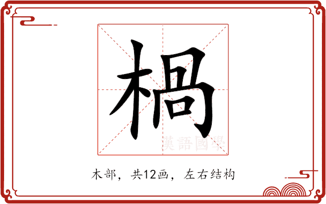 〔楇〕字是多音字,拼音是(guō、kuǎ),部首是木部,总笔画是12画。