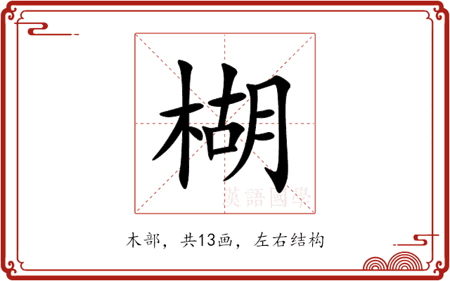 〔楜〕字是左右结构,可拆字为“木、胡”。
