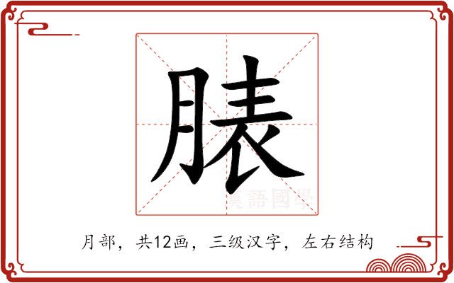 〔脿〕字拼音是(biāo),部首是月部,总笔画是12画