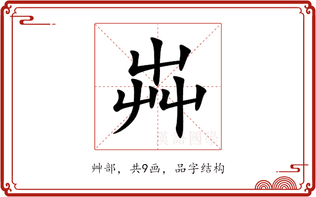 〔芔〕字是品字结构,三叠字 (三角三叠字),可拆字为“屮、艸”。