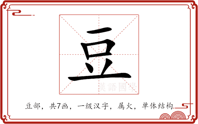 〔豆〕字造字法是象形。甲骨文字形,形似高脚盘,或有盖。汉字部首之一,从“豆”的字或与食器有关。或与豆类有关。本义是古代一种盛食物的器皿。