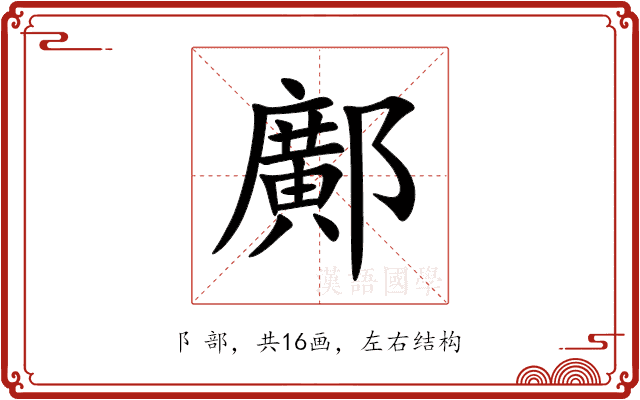 〔鄺〕字是左右结构,可拆字为“廣、阝”或“廣、⻏”。