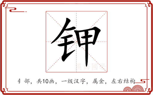 钾,通用规范汉字,一级汉字,序号1931,读音是(jiǎ),钅部,共10画,形声字,左右结构,五行属金。