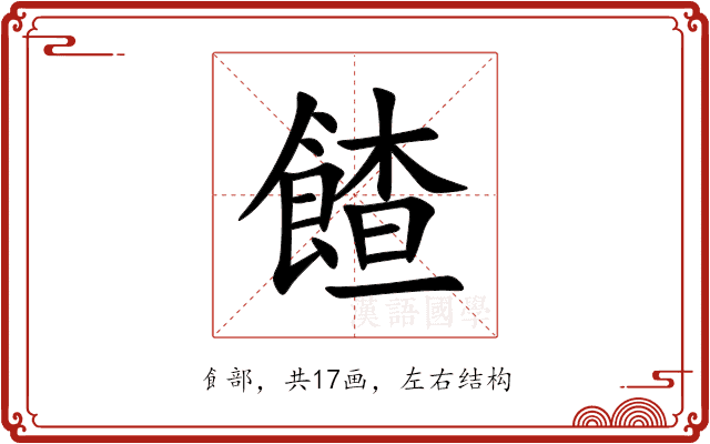 〔餷〕字拼音是(chā),部首是飠部,总笔画是17画