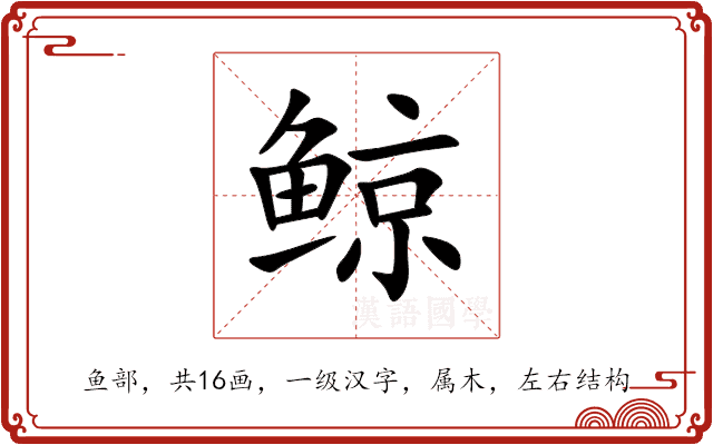 ◎形声。从鱼,京声。本义:鲸鱼) 同本义 whale哺乳动物,生活在海洋中,胎生,外形如大鱼,体长可达30米,是现在世界上最大的动物,前肢形成鳍,后肢完全退化,尾巴变成尾鳍,鼻孔在头的上部,用肺呼吸。