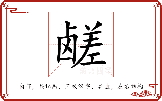 鹾,通用规范汉字,三级汉字,序号7857,读音是(cuó),卤部,共16画,左右结构,五行属金。