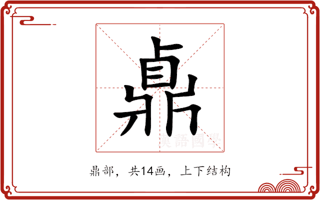 鼑,位于中日韩统一表意文字 (基本汉字),Unihan编码U+9F11,读音是(dǐng),鼎部,共14画,上下结构。