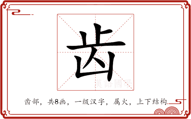 〔齿〕字是上下结构,可拆字为“止、凵、人”,五行属火。
