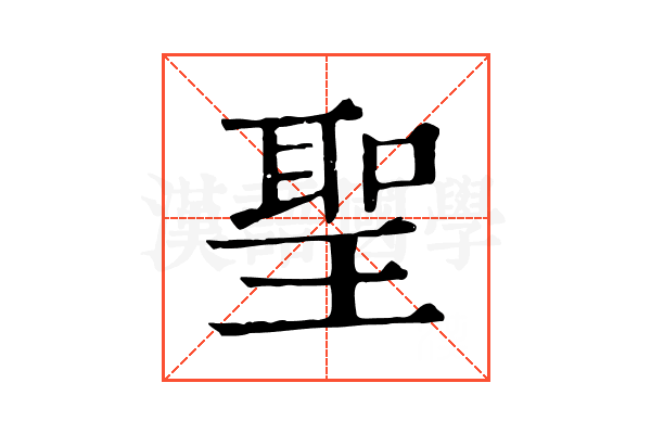 音《唐韻》、《集韻》、《韻會》、《正韻》𡘋式正切,聲去聲。《易・乾卦》:聖人作而萬物覩。《書・洪範》:睿作聖。【傳】於事無不通之謂聖。《禮・禮運》三代之英〔疏〕:萬人曰傑,倍傑曰聖。《孟子》:大而化之之謂聖。《風俗通》:聖者,聲也;聞聲知情,故曰聖也。