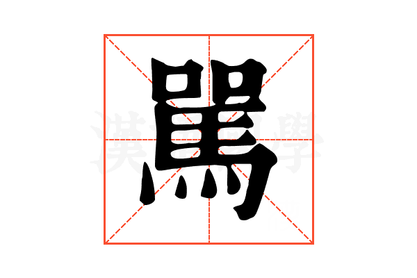 音又,《廣韻》:莫下切;《集韻》:母下切,𡘋音馬 —— 義同。《正字通》:按,六書本作傌,通作𦋻,俗作罵。駡載馬部,罵別載网部,此《字彙》編次之誤,今仍之。