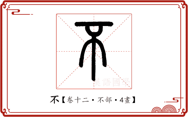 附注王國維《觀堂集林》:「不者,柎也。」高鴻縉《中國字例》:「羅振玉曰:『象花不形,花不為不之本義。』……不,原意為鄂足,象形字,名詞。後借用為否定副詞,日久而為借意所專,乃另造柎字以還其原。」按:不,孳乳為丕,金文用為丕顯字。《說文》解形誤,所訓為假借義。