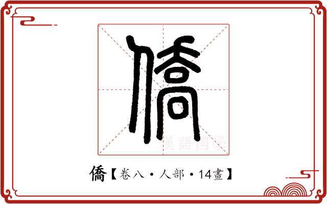 侨,高。字形采用“人”作边旁,采用“乔”作声旁。