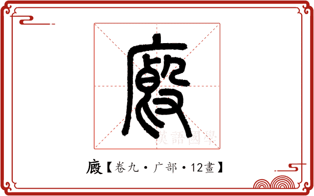 𠤙馬舍。從广㲃聲。《周禮》曰:「馬有二百十四匹爲廏,有僕夫。」