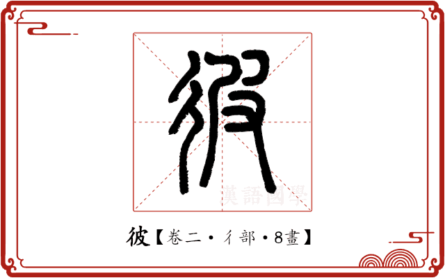 彼,所要前往的较远的远方。字形采用“彳”作边旁,采用“皮”作声旁。