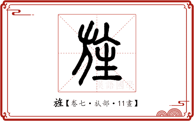 旌,在游帜飘动的战车上再插上旌旗,所谓旌旗,是剪下漂亮羽毛插在饰有牦牛尾的旗杆顶端,用以激励士卒精锐进取。字形采用 “”作边旁,“生”作声旁。