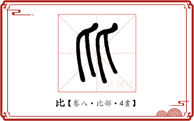 比,相从密切。两人相随构成“从”字,反写“从”字遂成“比”。所有与比相关的字,都采用“比”作边旁。夶,这是古文写法的 “比”字。