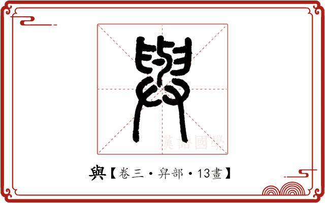 金文字形從舁、牙聲。從舁,舁字「從?廾」,像四手共舉;牙聲,聲兼義,像兩人用手鉤牙之形,表示給予。戰國文字「從舁、牙聲」,承金文字形而來。篆文形變為從舁、与聲。与聲,聲兼義,与為與字省舁,字形由牙字變體而來。《說文》古文從廾、与聲。隸書、楷書承篆文字形而來。在六書中屬於形聲兼會意。