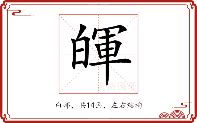 〔𤾈〕字拼音是(huī),部首是白部,总笔画是14画。