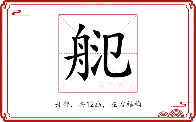 𦨲,位于中日韩统一表意文字扩展区B,Unihan编码U+26A32,读音是(fán),舟部,共12画,左右结构。