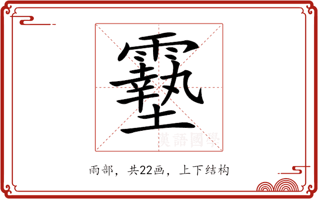 〔𩆔〕字拼音是(diàn),部首是雨部,总笔画是22画。