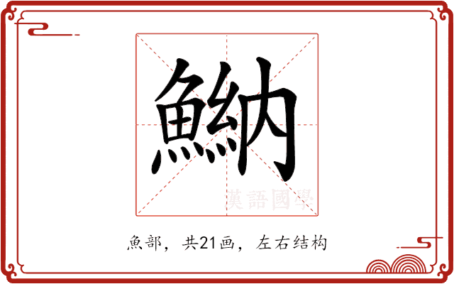 〔𩹾〕字拼音是(nà),部首是魚部,总笔画是21画。