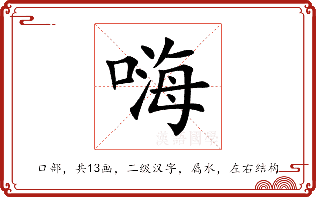 〔嗨〕字是左右结构,可拆字为“口、海”,五行属水。
