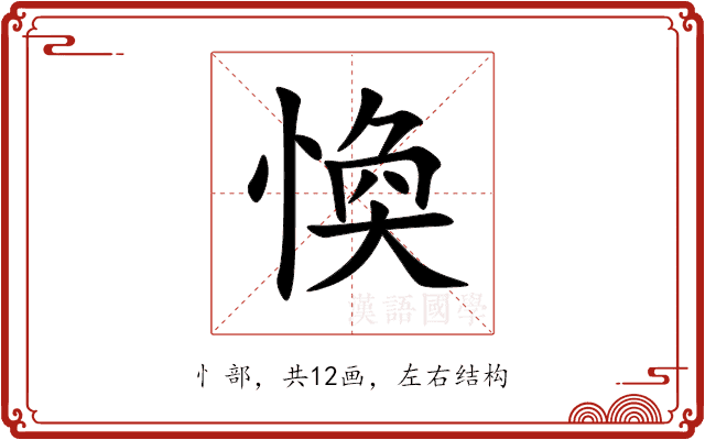 愌,位于中日韩统一表意文字 (基本汉字),Unihan编码U+610C,读音是(huàn),忄部,共12画,左右结构。