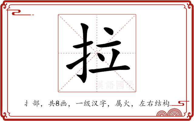 拉手(满人久别见面的一种礼节);拉拉(趿拉,即将鞋后帮踩在脚后跟下面);拉人(拉夫);拉火线(手榴弹等引爆的拉线)