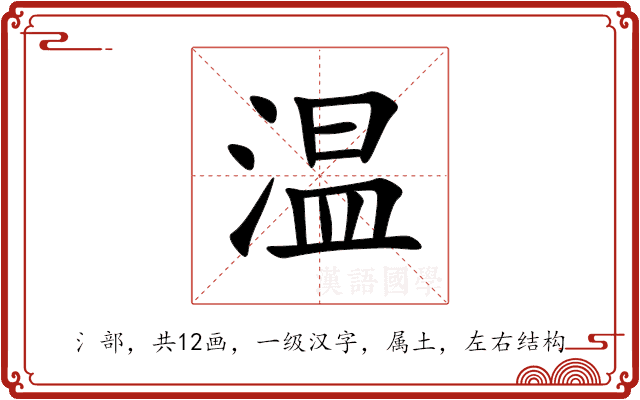 温克(温和恭敬并有克制力);温念(亲切的思念);温仁(温和仁爱);温言(温和的言辞);温好(柔和优美);温实(温厚诚实);温愿(温厚恭谨);温诚(温厚诚朴);温富(温厚富足);温敏(温厚聪敏);温顾(温存);温柔乡(喻美色迷人之境);温栗(温和而严谨)