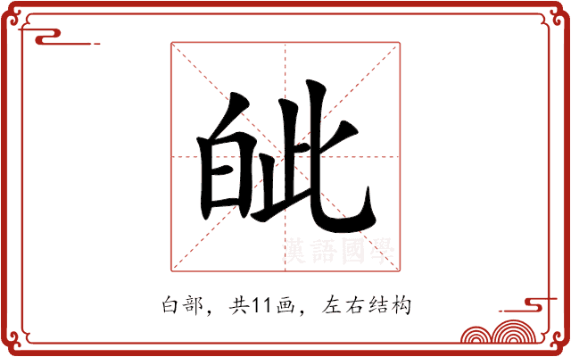 皉,位于中日韩统一表意文字 (基本汉字),Unihan编码U+7689,读音是(cǐ),白部,共11画,左右结构。